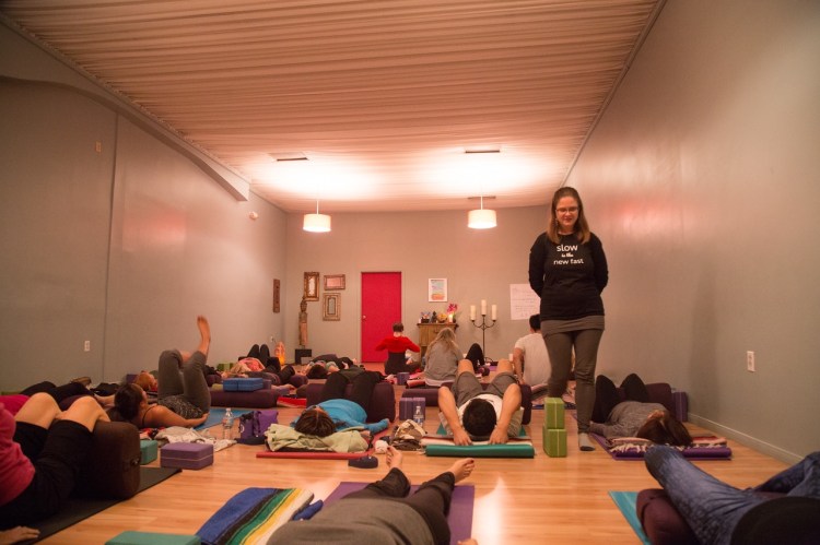 It’s fascinating to see the circuitous ways that some of the best teachers come to yoga. Take Addie deHilster, creator of Moved to Meditate, an Internet site dedicated to all forms of slow yoga practice. As a music major, Addie found herself constantly critiqued, growing increasingly frustrated, grumpy, and edgy. When a friend suggested she try yoga, Addie found a VHS tape created by Patricia Walden and Rodney Yee, and continued to practice along with it during graduate school. When a repetitive stress injury reared its ugly head, she was propelled into studying yoga beyond simply practicing to videos.